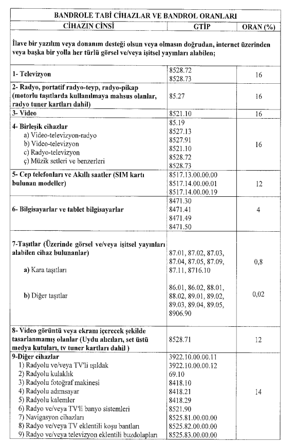 Tablo:  TRT Bandrol Ücretine Tabi Cihazlar ve Bandrol Oranları (08.08.2017 Tarihinden İtibaren Geçerli)