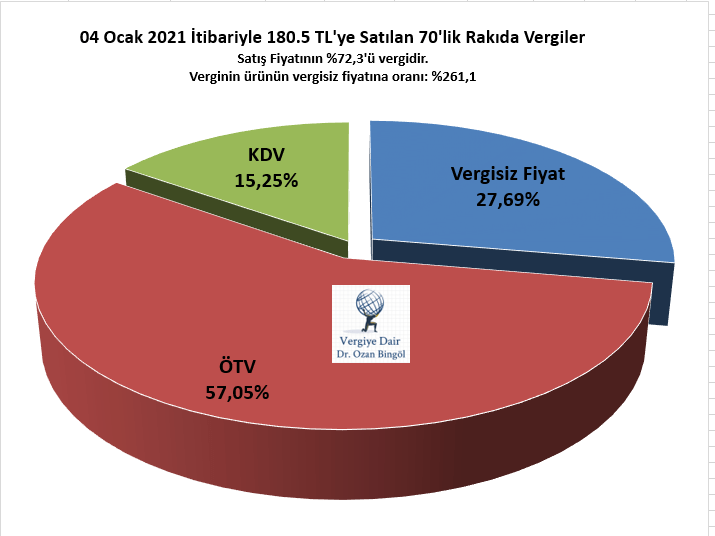 Alkollü içecekler üzerinden alınan maktu vergi ÖTV Kanununun 12 inci maddesinin 3 üncü fıkrası uyarınca altı ayda bir otomatik olarak artıyor. Bu artışın olmaması için Cumhurbaşkanının artış olmayacağı yönünde bir Karar alması gerekiyor. Temmuz-Aralık 2020 dönemine yönelik olarak bu otomatik artış olmayacağı yönünde bir Cumhurbaşkanı Kararı yayımlanmadığı için alkollü içecek fiyatlarında Türkiye İstatistik Kurumu tarafından ilan edilen üretici fiyat endeksinde son altı ayda meydana gelen değişim oranında artış meydana geldi ve GİB bu artışa göre yeni listeyi sitesinde yayımladı. Otomatik ÖTV artışı sonrası Rakıda vergili vergisiz fiyatları sizler için hesapladım: