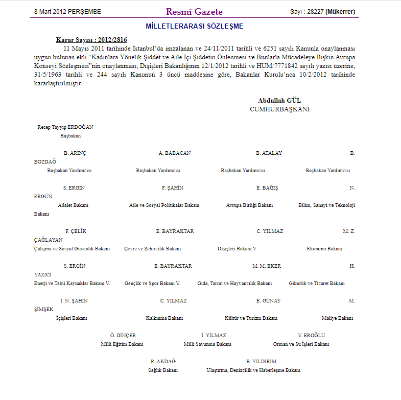 İSTANBUL SÖZLEŞMESİNİ ONAYLAYAN BAKANLAR KURULU KARARI