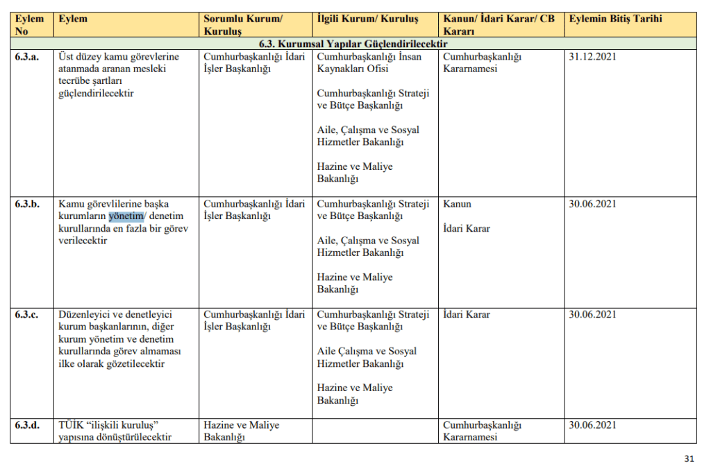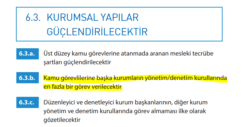 • Ekonomi reformun paketinde yer alan “Kamu görevlilerine başka kurumların yönetim/denetim kurullarında en fazla bir görev verilecektir.” şeklinde eylem hem hatalı hem de eksiktir. Hatalıdır. Çünkü 2011 yılında bu konuda yapılmış kanuni düzenleme söz konusudur. Ekonomi reformunu ve eylem planını hazırlayanların bundan habersiz olması reforma ilişkin ciddi şüpheler uyandıran bir konudur. Eksiktir. Çünkü, asıl tartışılması gereken kamu görevlilerinin başka kurumlarda sadece bir yönetim/denetim kurulu üyesi olması değildir. Asıl konu, bu görevlendirmelerde esas alınan kıstaslar, bu görevlendirmeler nedeniyle yapılan ödeme ve diğer pek çok menfaattir.