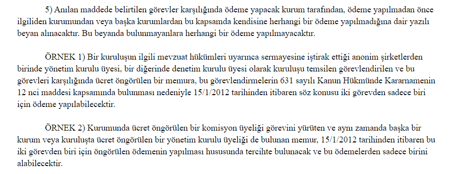 “Memurlar ve diğer kamu görevlilerinden, kurum ve kuruluşların yönetim kurulu, denetim kurulu, tasfiye kurulu, danışma kurulu üyelikleri ve komisyon, heyet, komite ile benzeri organlarda görev alanlara, kurum içi ve kurum dışı ayrımı yapılmaksızın bu görevlerinden sadece biri için ücret ödenebilir. Bu maddenin uygulanmasında oluşacak tereddütleri gidermeye Maliye Bakanlığı yetkilidir.”