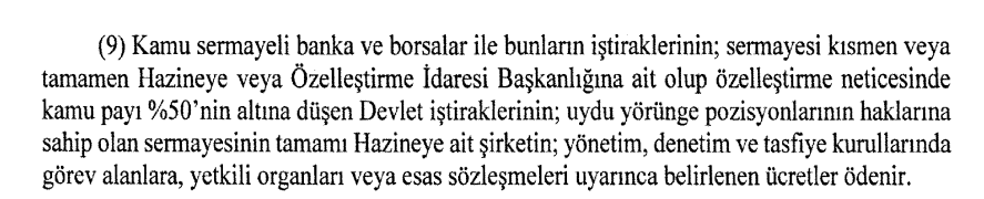 Yukarıdaki düzenlemeye göre, kamu bankaları, İstanbul Menkul Kıymetler Borsası, Takasbank ve benzeri pek çok kuruluşta görev alan kamu görevlileri Cumhurbaşkanı Kararı ile belirlenen limitlere tabi değildir. Yönetim kurulu başkan veya üyesi olduğu kuruluş ne kadar takdir ederse o kadar ücret alacaktır.