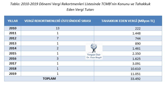 Yayımlanan en son vergi rekortmeni listesi 2019 yılına ilişkin olduğu için 2010-2019’u kapsayan on yıllık dönemi esas aldık. Buna göre on yıllık dönemde TCMB;