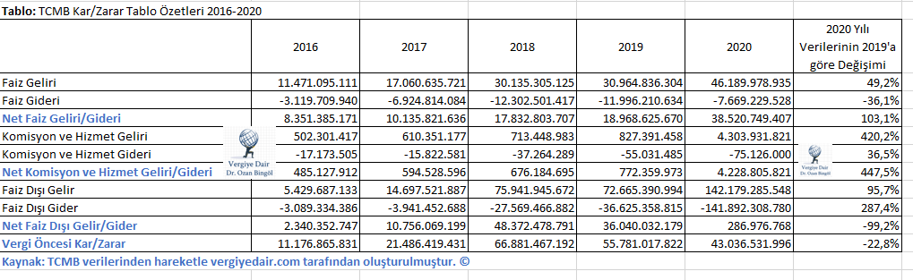 Tablo: TCMB Kâr/Zarar Tabloları Özetleri (2016-2020)
