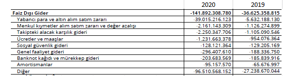 - Net faiz dışı gelir ise önceki yıllardaki performansın çok gerisinde kalmış 2018 yılında 48.4 TL, 2019 yılında 36 milyar TL olarak gerçekleşmiş olan net faiz dışı gelir 2020 yılında sadece 286 milyon TL olarak gerçekleşmiştir.
