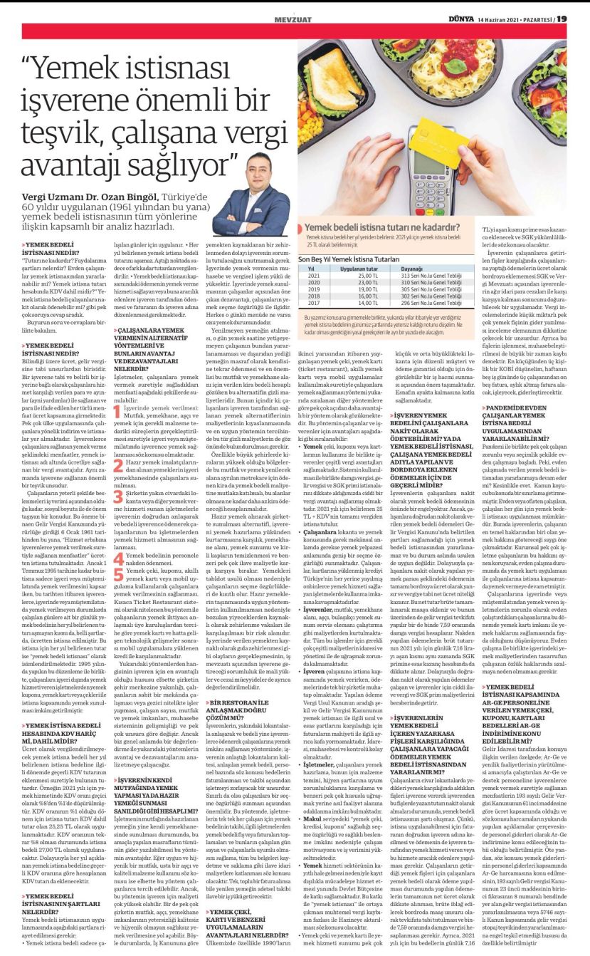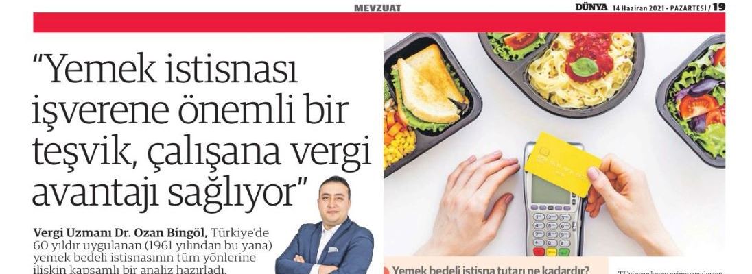 Dünya Gazetesinin 14 Haziran 2021 tarihli sayısında “Yemek İstisna Bedelini” soru ve cevaplarla ayrıntılı olarak yazdım. Yemek bedeli istisnası nedir? Tutarı ne kadardır? Faydalanma şartları nelerdir? Evden çalışanlar yemek istisnasından yararlanabilir mi? Yemek istisna tutarı hesabında KDV dahil midir? Yemek istisna bedeli çalışanlara nakit olarak ödenebilir mi? gibi pek çok soruya cevap aradık.