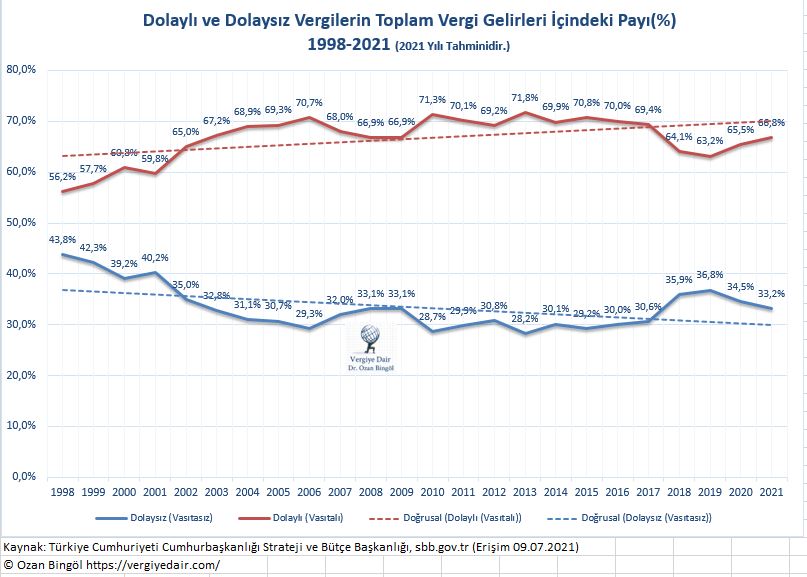 Görüldüğü üzere 1998 yılında vergi yapımız %56,2 dolaylı, %43,8 dolaysız vergilerden oluşmakta iken, 2020 yılında dolaylı vergilerin toplam vergiler içindeki payı %66,8 olmuştur. 1998-2020 döneminde dolaylı vergilerin oranının yüzde 70’in üzerine çıktığı yıllar da olmuştur. Dolaylı ve dolaysız vergi ile ilgili uzun vadeli eğilimin ise dolaylı vergi oranlarının toplam vergiler içindeki payının artış, dolaysız vergilerin ise azalış yönünde olduğudur.