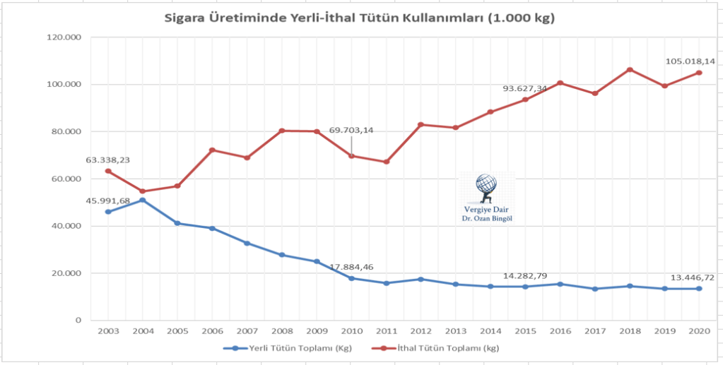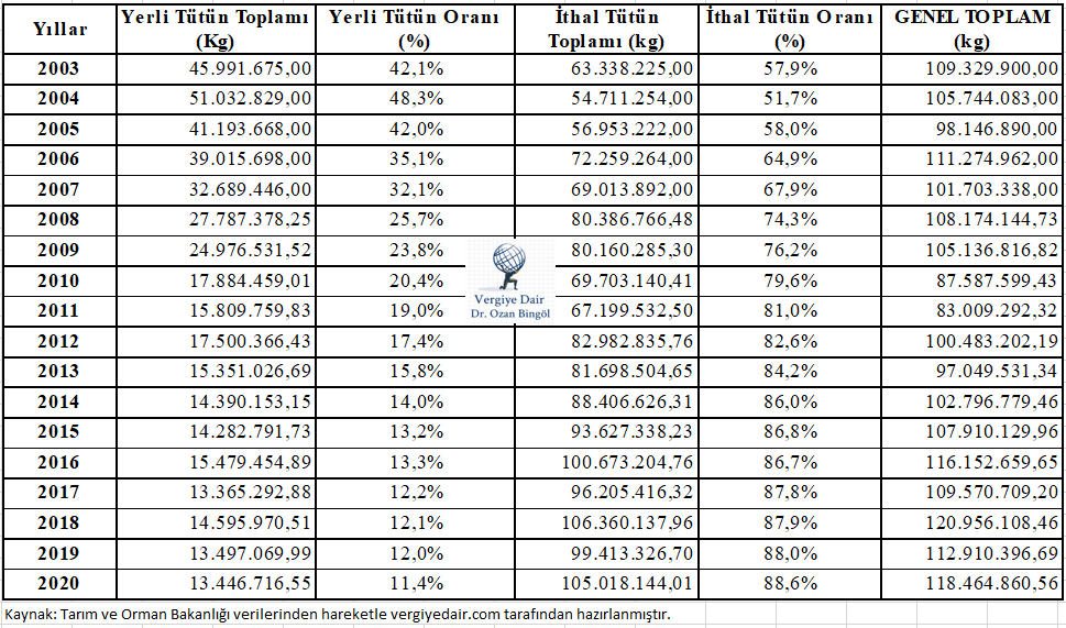 Yukarıdaki tablodan da görüldüğü üzere %40’ların üzerindeki yerli tütün kullanım oranı, 2020 yılına geldiğimizde yüzde 11,4’e kadar inmiştir.