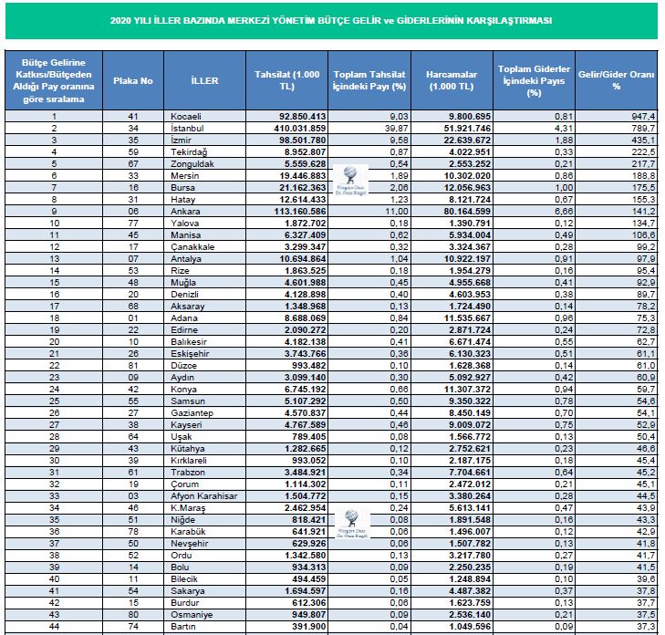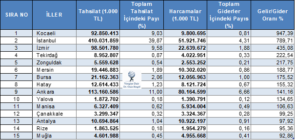 Yukarıdaki tabloya göre bütçeye gelir katkısı ile bütçeden bu il için yapılan gider oranı açısından ilk sırada Kocaeli yer almaktadır. Kocaeli’ni İstanbul, İzmir ve Tekirdağ izlemektedir. 11. Sıradaki Manisa’dan sonraki 80 ilin bütçeye katkısı bu iller için merkezi yönetim bütçesinden yapılan harcamanın altında kalmıştır. Kocaeli ve İstanbul’un sanayi ve ticaret merkezi olması bütçe gelirlerine katkılarının yüksekliğinin en önemli nedenleri arasında yer almaktadır. İstanbul’un aynı zamanda Bankaların merkezinin bulunduğu il olması da finans sektöründen alınan vergilerin yoğunlukla bu ilde tahsil edilmesi sonucunu doğurmaktadır. Kocaeli’nin, sanayi tesislerinin yanında, özellikle rafineri nedeniyle Akaryakıt üzerinden alınan ÖTV nedeniyle üst sıralarda yer alması söz konusudur.
