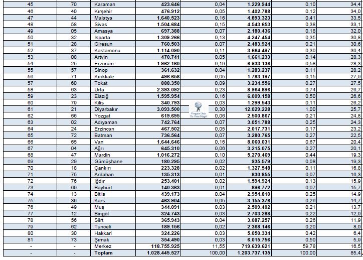 Yukarıdaki tabloda yer alan veriler, illerin ekonomik gelişmişliği, lojistik imkanları, vergiye bakış ve vergi ödeme gayreti, vatandaşın devlete bakışı ve devletten beklentisi gibi pek çok ekonomik, ticari ve sosyal etkenleri yansıtmaktadır.