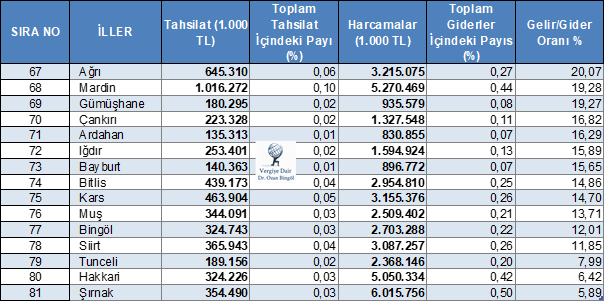 Yukarıdaki tabloya göre, tabloda yer alan illerden elde edilen bütçe geliri ile bu iller için bütçeden yapılan harcama arasındaki makas çok açılmıştır. Örneğin Şırnak, Hakkari ve Tunceli’den elde edilen bütçe gelirlerinin 15 katı kadar bu illere bütçeden harcama yapılmaktadır. Ağrı, Mardin, Gümüşhane gibi illerde bu oran 5 katıdır.