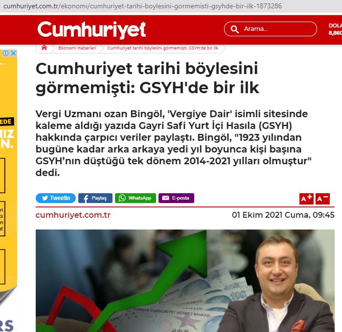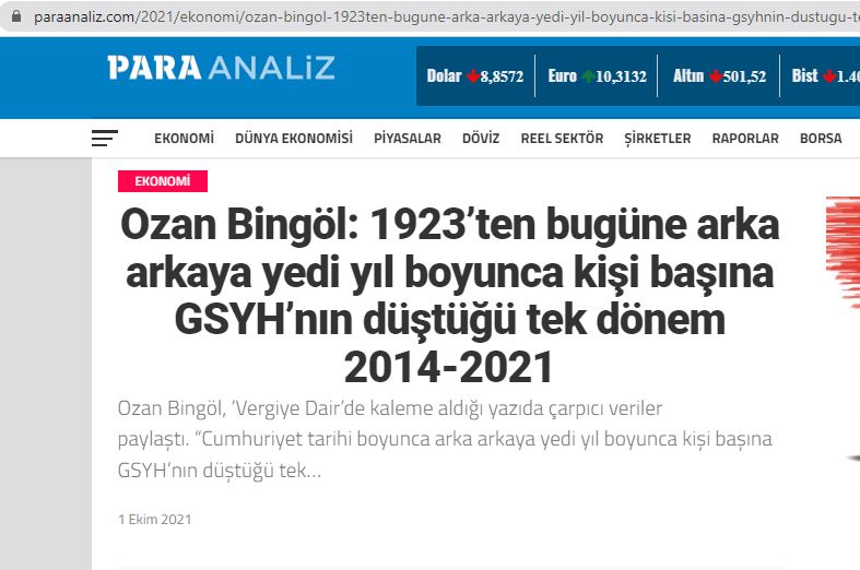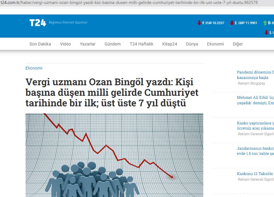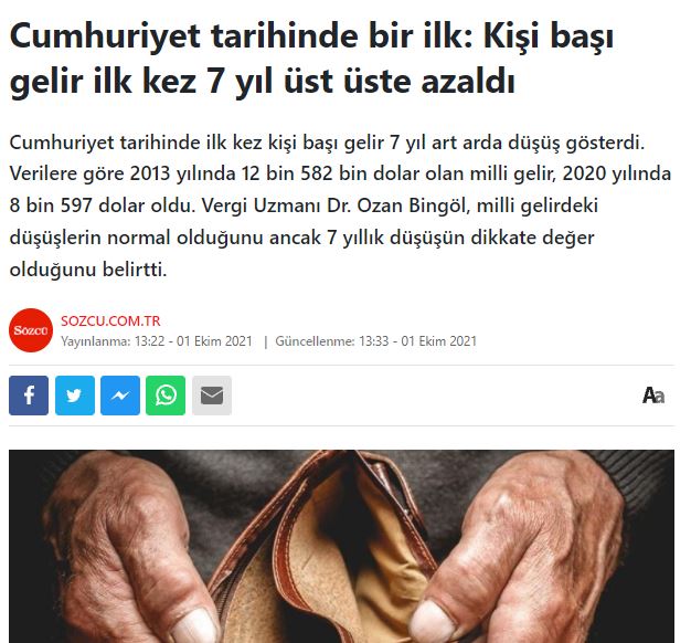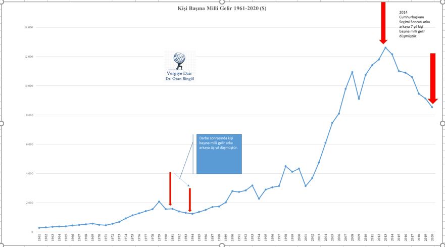Cumhuriyet tarihi boyunca arka arkaya yedi yıl boyunca kişi başına GSYH’nın düştüğü tek dönem 2014-2021 yıllarını kapsayan yedi yıllık dönem olmuştur. Daha önce sadece ikinci dünya savaşı yıllarında arka arkaya dört yıllık bir kişi başına gelir düşüşü yaşanmıştır. Dünya ekonomik buhran dönemi, 1980 darbesi dönemlerinde bile kişi başına gelir düşüşleri en çok arka arkaya üç yıl sürmüştür.