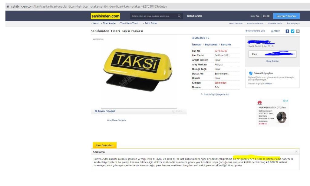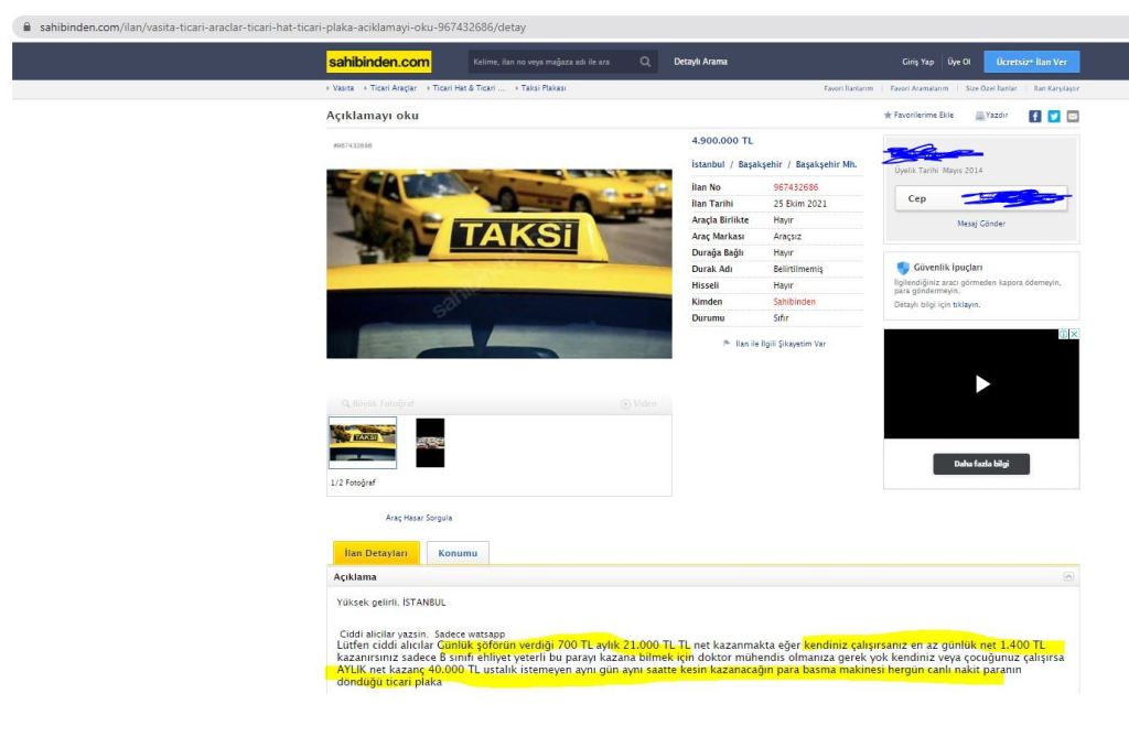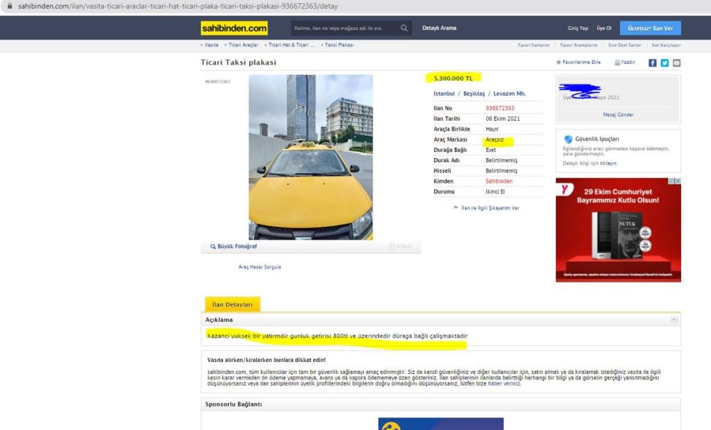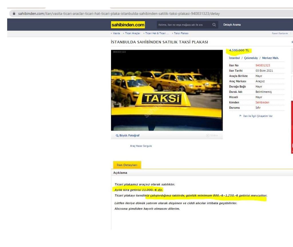 Bir taksi işletmesi nedeniyle yapılan iş hasılatının 2021 yılında 76.000 TL’yi aşlamaması demek, taksinin günlük hasılatının en fazla 208 lira 22 kuruş olması anlamına gelir. Oysa sahibinden.com ve diğer sitelerde yapılan araştırmalarda, taksi sahiplerinin plaka kirası olarak aylık 10.000 TL’nin üzerinde kira talep ettikleri, bu kiraya ilaveten galericilerin de komisyon aldığı, taksi şoförünün da bir miktar para kazandığı dikkate alındığında günlük hasılatın ortalama 1.000 TL civarında olması gerektiği sonucu ortaya çıkmaktadır.
