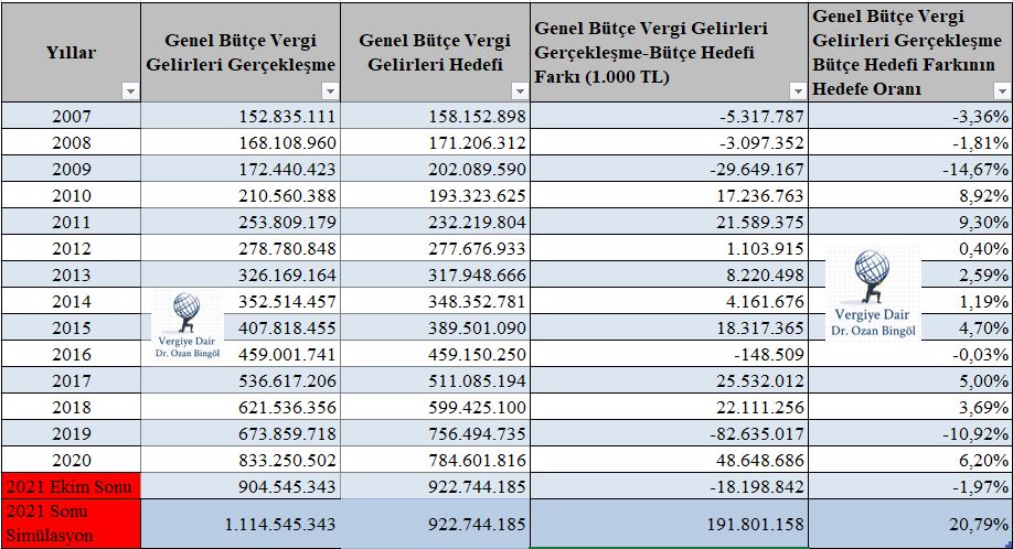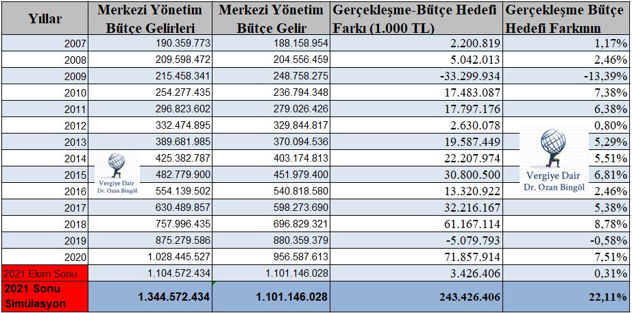 Yukarıdaki tabloya göre, 2021 yılı Ekim sonu verilerine göre Merkezi Yönetim Bütçe gelirleri yıl sonu bütçe gelir hedefini aşmıştır. 2021 yılının Kasım ve Aralık aylarında 240 milyar lira daha gelir tahsilatı yapılacağı varsayımı ile 2021 yılında bütçe gelir gerçekleşmesi bütçe hedefinin %22,11 üzerinde olacaktır. Bu daha önceki 15 yılda hiç gerçekleşmemiş büyüklükte bütçe hedefinin üzerinde bir gelir gerçekleşmesi olacaktır.