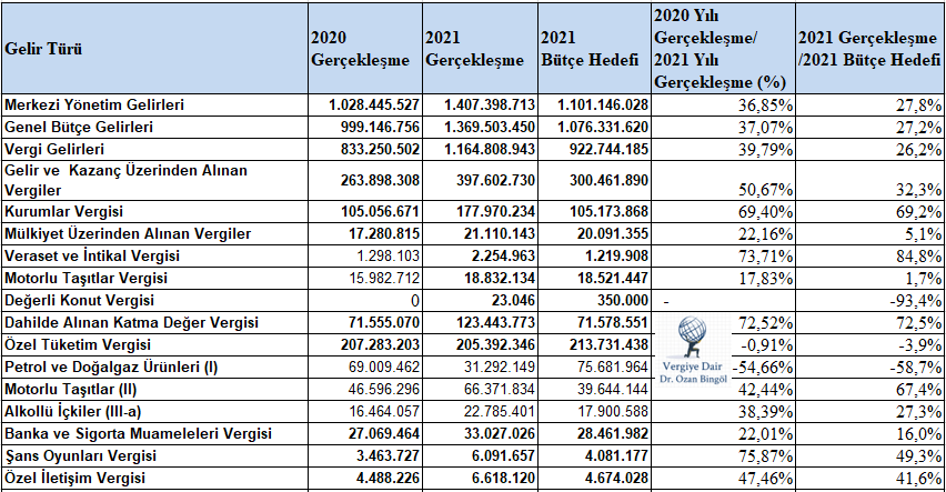 Tablo: 2021 Yılı Merkezi Yönetim Bütçe Gelirlerinin 2020 Yılı Gerçekleşmeleri ve Bütçe Hedefine Göre Artış Oranları