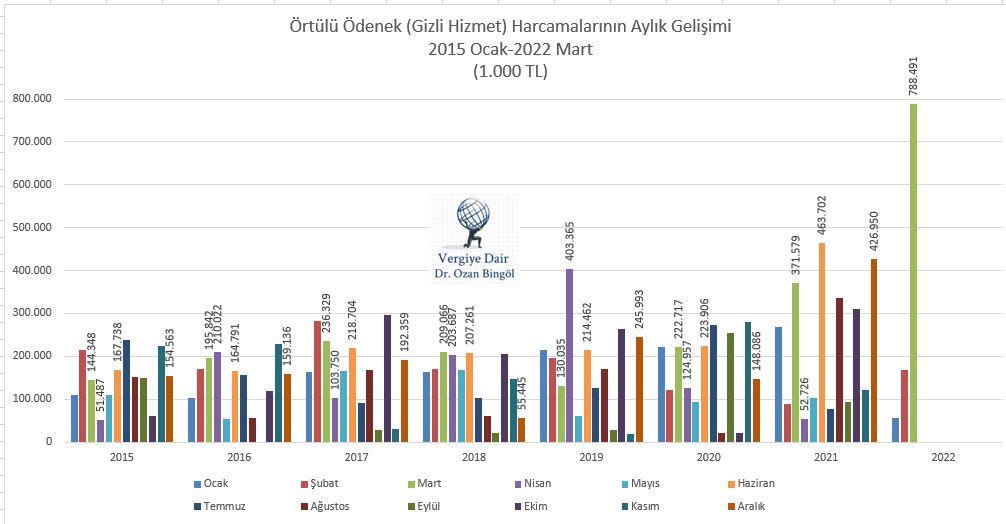 Örtülü ödenek harcamalarının aylık bazda gelişimi 2015/OCAK-2022/MART dönemi için incelenmiş ve sonuçlar aşağıdaki grafikte sunulmuştur.