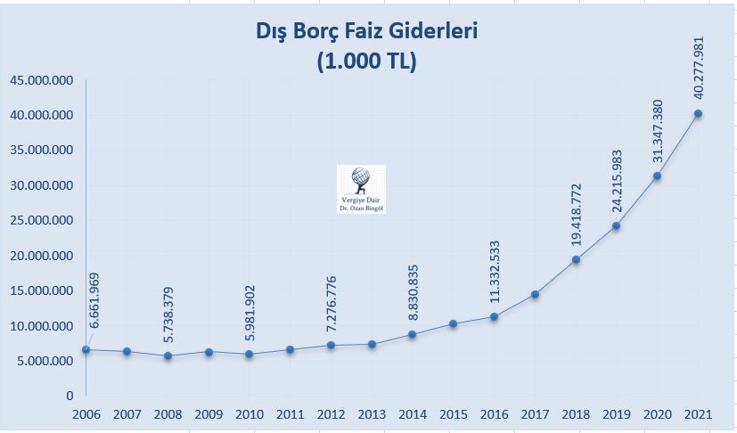Dış borç faiz ödemelerinin son yıllarda, özellikle 2016 yılı sonrasında hızlı bir artış trendine girdiği yukarıdaki grafikten net bir şekilde görülmektedir. 2014 yılında bir yılda 8,8 milyar TL olan dış borç faiz ödemesi 2021 yılında %356,1 artışla 40,2 milyar lira olmuştur. Vergi gelirlerinin 40,2 milyarı dış borç faiz ödemesi olarak, sadece bir yılda ülke dışına çıkmıştır.