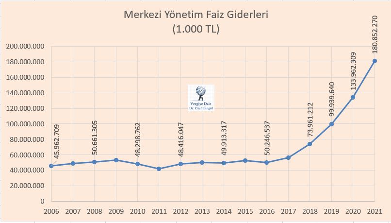 2006 Ocak-2022 Mart döneminde merkezi yönetim bütçesinden yapılan faiz gideri ödeme tutarı 1 trilyon 170 milyar 940 milyon 408 bin TL olarak gerçekleşmiştir. Aynı dönemde 7 trilyon 204 milyar 748 milyon 683 bin lira vergi tahsil edilmiştir. Dolayısıyla 2006-2022 Mart döneminde toplanan her yüz liralık verginin 16 lira 25 kuruşu sadece faize gitmiştir. 2022 yılının ilk üç ayında ise toplanan her yüz lira verginin 18 lira 64 kuruşu faize gitmiştir.