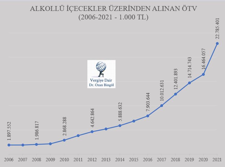Alkollü içecekler üzerinden temelde iki vergi alınmaktadır. Bunlar ÖTV ve KDV’dir. Her iki vergi de dolaylı vergi olarak bilinir. Alkollü içecekler üzerinden 2006-2021 döneminde tahsil edilen Özel Tüketim Vergisi 121,4 milyar liradır. Alkollü içeceklerden tahsil edilen vergilerin tutarı ve toplam vergiler içindeki payı sürekli olarak artmaktadır. Sadece 2021 yılının on iki ayında alkollü içecekler üzerinden tahsil edilen ÖTV 22,7 milyar TL’ye ulaşmıştır. Oysa aynı yıl için bütçe hedefi 17,9 milyar idi. 12 Ayda bütçe hedefinin çok üzerinde ÖTV tahsilatı yapılmıştır. Bu tutarlara ayrıca KDV’yi de eklememiz gerekmektedir. Bu durumda alkollü içecekler üzerinden tahsil edilen meblağ çok daha büyür.
