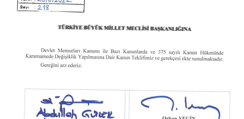Devlet Memurları Kanunu ile Bazı Kanunlarda ve 375 sayılı Kanun Hükmünde Kararnamede Değişiklik Yapılmasına Dair Kanun Teklifi Adalet ve Kalkınma Partisi Grup Başkanlığı tarafından 28.06.2022 tarihinde Türkiye Büyük Millet Meclisi Başkanlığına Sunuldu. Aşağıda Söz konusu Kanun Teklifinin tam metnine ulaşabilirsiniz.