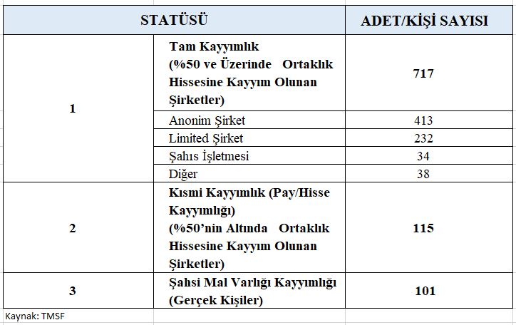 TMSF verilerine göre Mart 2022 tarihi itibarıyla, Türkiye’nin 36 ilinden toplam 709 adet şirket/ticari işletmenin kayyımlarının yetkileri TMSF’ye devredilmiş veya bu şirketlere TMSF kayyım olarak atanmıştır. Ayrıca, 104 şirketin %50’nin altındaki hisseleri ile 101 gerçek kişinin mal varlıklarına da TMSF kayyım olarak atanmıştır. Söz konusu şirket/ticari işletmelerden derlenen bilgilere göre, 709 adet şirket/ticari işletmenin 31.12.2021 itibarıyla;