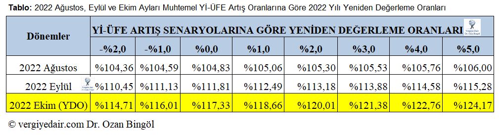 Yukarıda görüldüğü üzere, önümüzdeki üç iki ayda her ay enflasyonun hiç artmadığı, başka bir deyişle sıfır olduğu bir senaryoda bile 2022 yılı yeniden değerleme oranı %117,33 %118,92 olmaktadır. Bu haliyle 2022 yılı yeniden değerleme oranı, 1984 yılından bu yana en yüksek yeniden değerleme oranı olarak tarihe geçecektir.