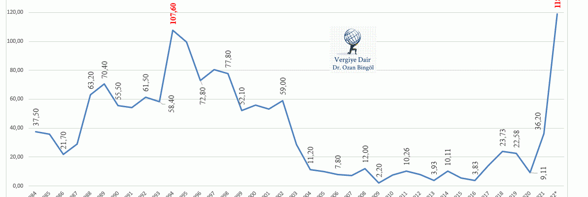 Şimdi gelelim 1984 yılından bu yana yeniden değerleme oranlarının seyrine. Yeniden değerleme oranları 1984 yılından bu yana nasıl gelişmiş, en çok yüzde kaç olmuş? Bu yıl ortaya çıkması muhtemel yüksek YDO rakamı bu tarihsel süreçte kendisine nerede yer bulacak?