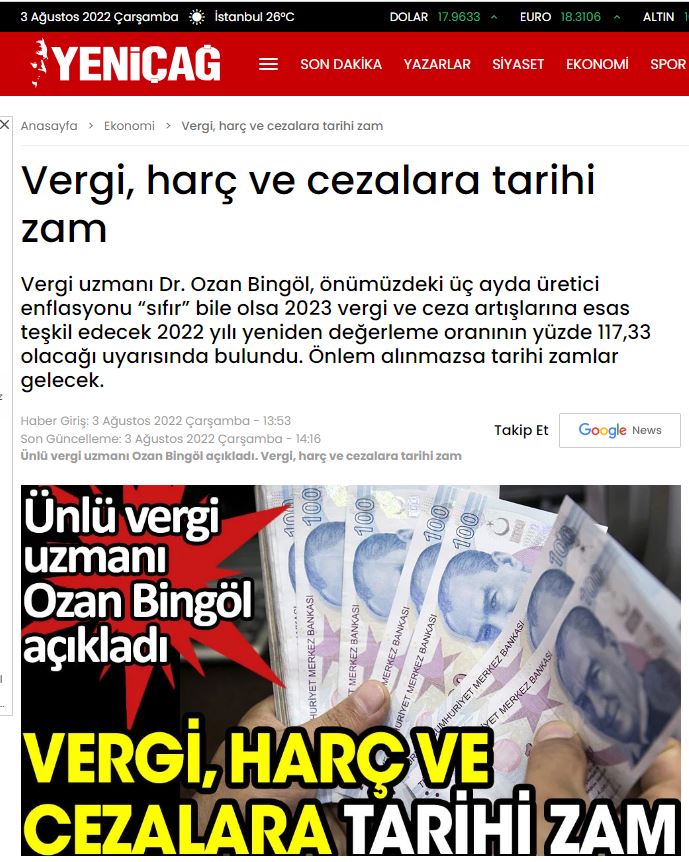 Vergi uzmanı Ozan Bingöl: Yeniden değerleme oranında tarihi rekor geliyor. “Önlem alınmazsa vergi ve cezalar can yakacak”. Çarşamba 3 Ağustos 2022 11:26.