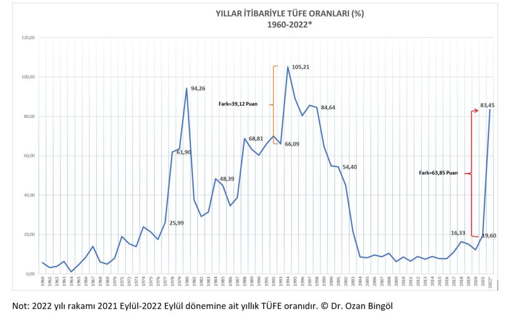 Yaşı ilerlemiş pek çok kişiden bile, “Ben böyle enflasyon daha önce ne gördüm, ne yaşadım.” sözünü daha sık duyar olduk. Aslında bu sözün gerçeklik payı var. 1960 yılından bu yana TÜFE artışlarını inceleyince bir önceki yıla göre bu denli hızlı artmış bir yıla rastlamadık. İşte bu yüzden 2022 yılında yaşadığımız enflasyon herkesi adeta çarpıyor.