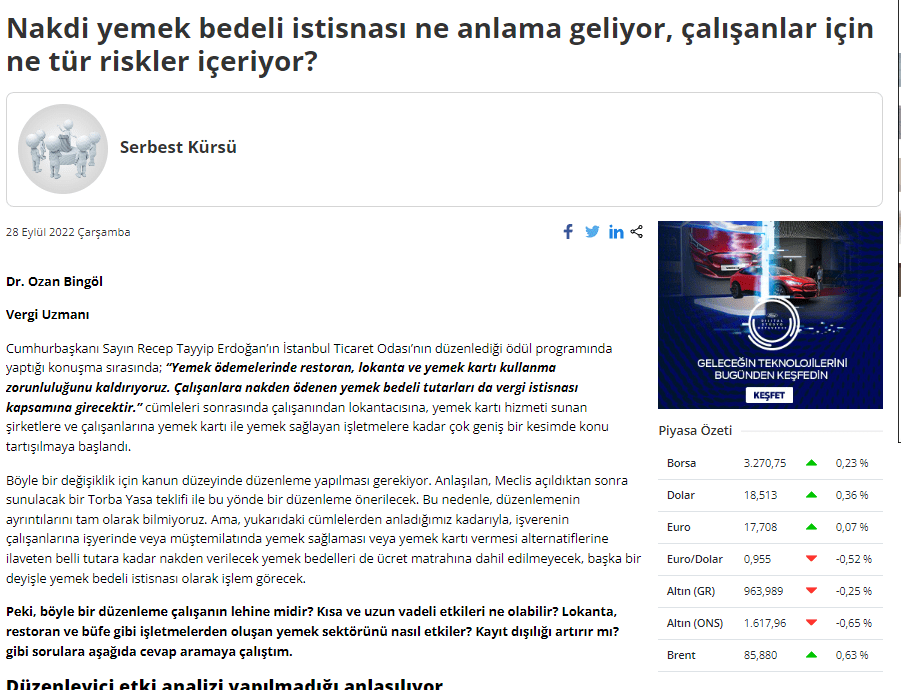 Cumhurbaşkanı Sayın Recep Tayyip ERDOĞAN’ın İstanbul Ticaret Odası’nın düzenlediği ödül programında yaptığı konuşma sırasında; “Yemek ödemelerinde restoran, lokanta ve yemek kartı kullanma zorunluluğunu kaldırıyoruz. Çalışanlara nakden ödenen yemek bedeli tutarları da vergi istisnası kapsamına girecektir.” cümleleri sonrasında çalışanından lokantacısına, yemek kartı hizmeti sunan şirketlere ve çalışanlarına yemek kartı ile yemek sağlayan işletmelere kadar çok geniş bir kesimde konu tartışılmaya başlandı.