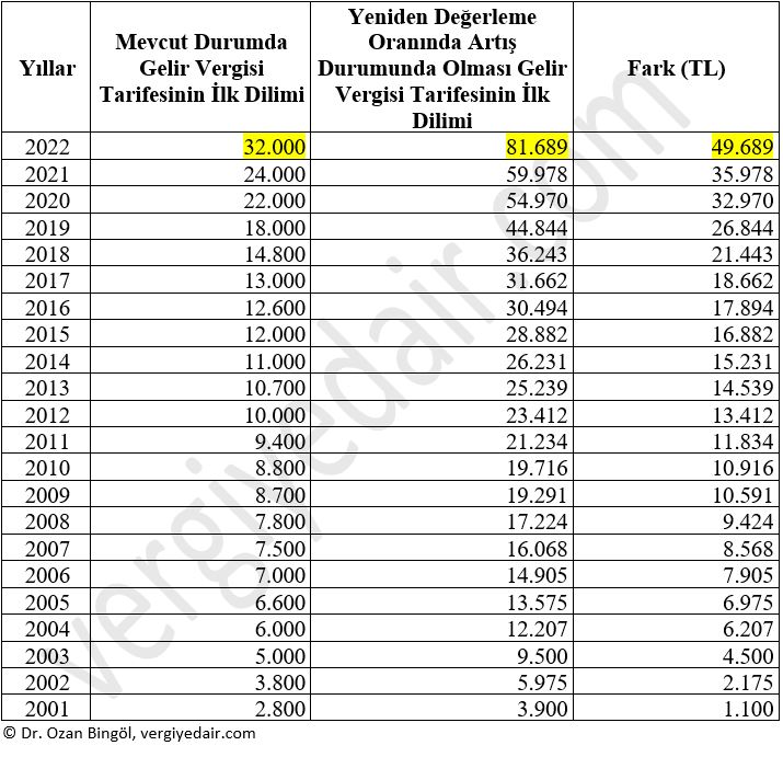 Örneğin 2000 yılından bu yana gelir vergisi dilimleri her yıl yeniden değerleme oranı kadar kuruşu kuruşuna artırılsa idi ilk dilim 2022 yılı için 32.000 TL değil 81.689 TL olacaktı. Bugün yıllık 80.000 TL ücret geliri elde eden bir kişi %27’lik gelir vergisi dilimine girerken, normal şartlarda %15’lik gelir diliminde olacak idi.