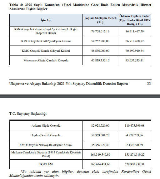 Sayıştay sözleşme bedeli KDV hariç 560,6 milyon TL, KDV dahil 661,5 milyon TL olan, fiyat artışları ile birlikte 800 milyar lira ulaşması muhtemel olan “müşavirlik işleri” ihalelerinin, ihale tarihleri itibarıyla Bakanlık tarafından belirlenmediği, KGM tarafından esas ve usuller olmadan müşavirlik hizmet alım ihalelerine çıkıldığını tespit etmiştir.