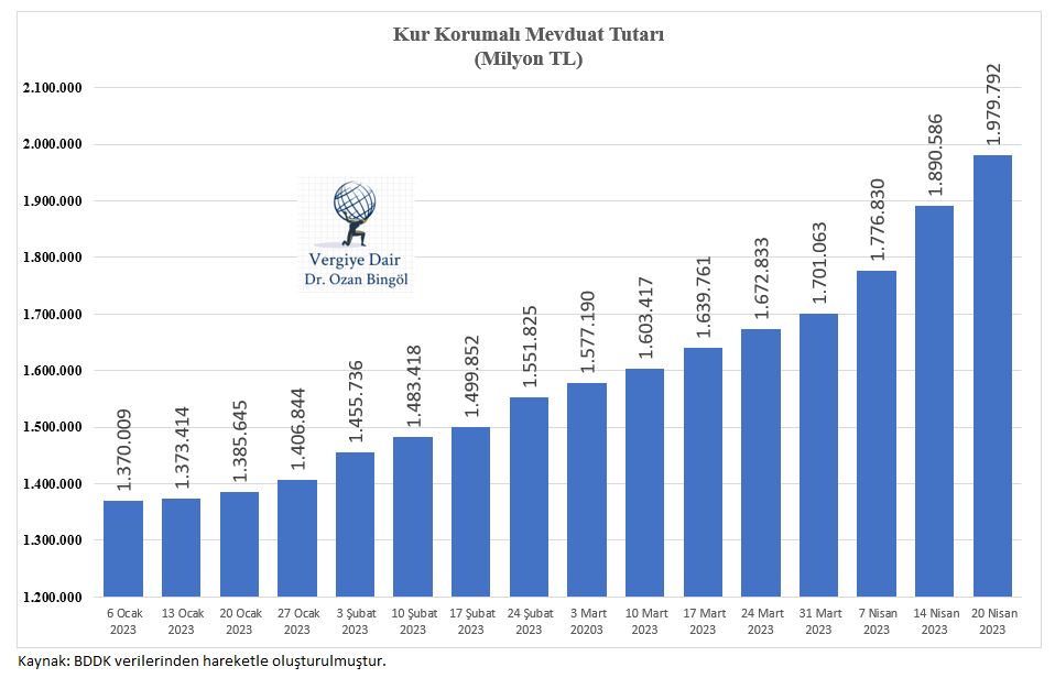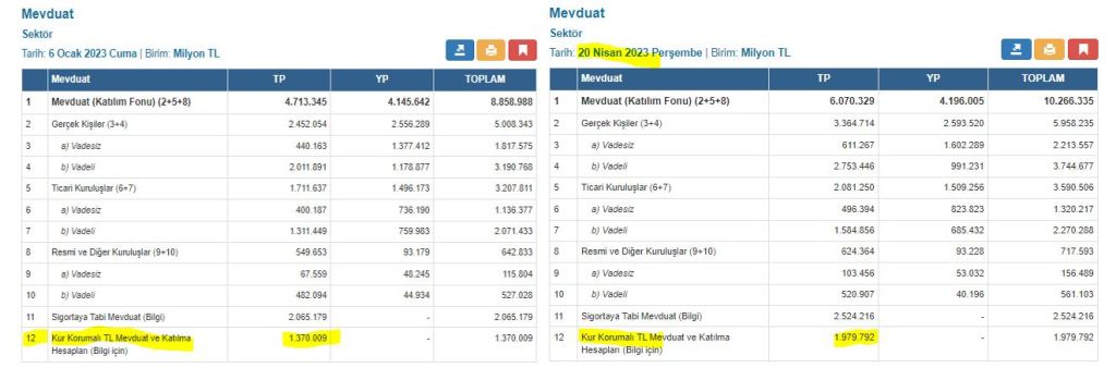 Kur korumalı mevduattaki artış inanılmaz boyutlara ulaşmış bulunuyor. Yıl başından 20 Nisan tarihine kadarki 3,5 aylık dönemdeki artış 609,8 milyar lira olmuştur. Ancak artış son dönemde daha da hızlanmıştır. Mart başından 20 Nisana kadar olan dönemdeki artış 428 milyar liradır. Son iki haftalık artış ise 203 milyar lira olmuştur. Neredeyse geometrik şekilde bir artış söz konusu.