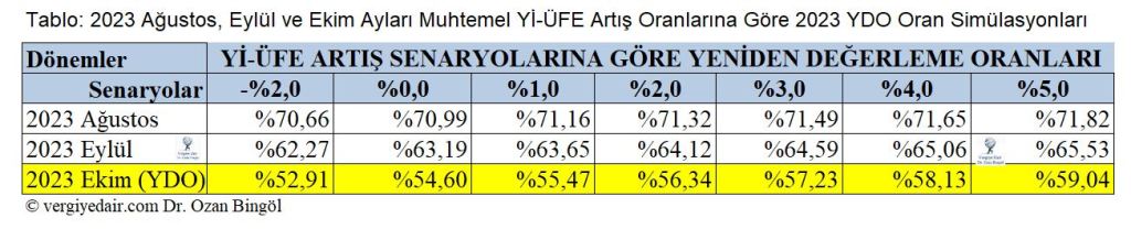Biz burada önümüzdeki Ağustos, Eylül ve Ekim aylarında oluşması muhtemel Yİ-ÜFE artışlarına göre bir tür simülasyon yaparak bizi ne büyüklükte bir yeniden değerleme oranının beklediğini ortaya koymaya çalıştık. Böylece 2024 yılı vergi, harç ve ceza artışlarında dikkate alınacak 2023 yılı yeniden değerleme oranının yüksekliğine ilişkin ilgililer gerekli mevzuat düzenlemesi için uyarılmış olur ve umulur ki bazı önlemler alırlar.