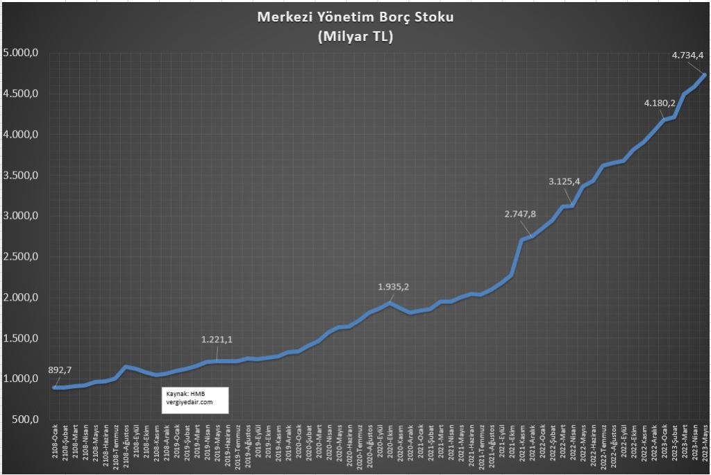 Merkezi Yönetim Borç Stoku sadece Ocak 2018-Mayıs 2023 döneminde 892,7 milyar liradan 4 trilyon 734,4 milyar liraya çıkmıştır. Artış 3 trilyon 841,7 milyar liradır. Artış oranı %430 olmuştur. Aynı dönemdeki TÜFE artış oranıysa %293,2 olmuştur. Bu durum, mali disiplinden uzaklaşılmasının ve kötü borç yönetiminin bir sonucu olarak karşımıza çıkmaktadır.