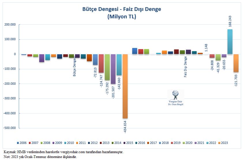 Aşağıdaki grafikte görüldüğü üzere Merkezi Yönetim Bütçesi 2006 yılından bu yana sürekli açık vermektedir. Ancak, 2018 yılından itibaren açıktaki büyümenin belirgin hale geldiği görülmektedir. 2022 yılı hariç tutulduğunda 2019 yılından bu yana her yıl faiz dışı denge de negatife dönmüştür. 2023 yılının ilk yedi ayındaki faiz dışı açık devasa boyutlara ulaşmıştır.