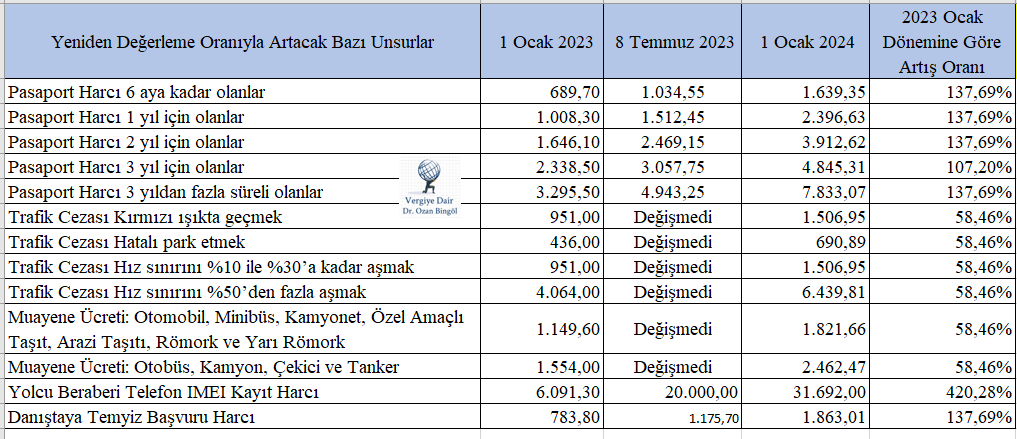 2023’ün ortasında yapılan bazı vergi artışları sonucu, bir yıllık harç ve vergi artışı bazı kalemler için oldukça yüksek oranlara erişmiş bulunmaktadır.