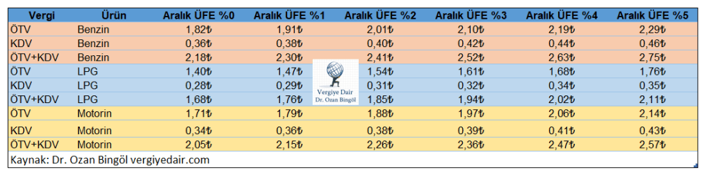 Tablo 1: Aralık ayı Yİ-ÜFE artışına bağlı olarak akaryakıt ürünlerinin otomatik artacak yeni maktu ÖTV tutarları simülasyonu