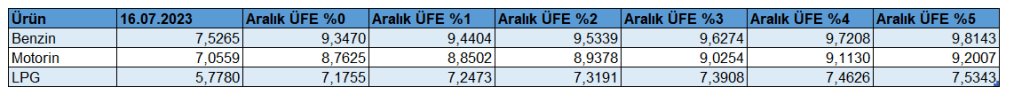 Yukarıdaki tablodan görüleceği üzere; Aralık 2023 dönemi aylık Yİ-ÜFE oranı %0 bile gelse bir litre benzin için pompaya yansıyacak ÖTV+KDV zammı 2 lira 18 kuruş olacaktır. Eğer Yİ-ÜFE %5 gelirse bu kez pompaya yansıyacak ÖTV+KDV vergi zammı 2 lira 75 kuruş olacaktır.