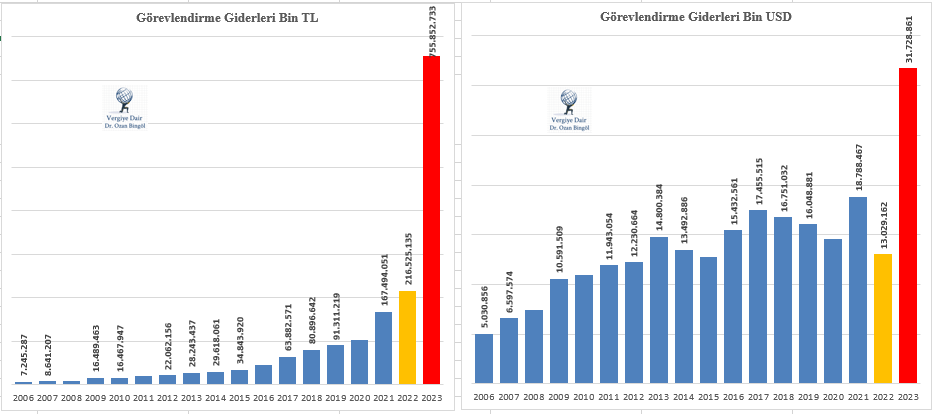 Şekil 2: 2006-2023 Dönemi Görevlendirme Giderleri (1.000 TL, 1.000 USD)