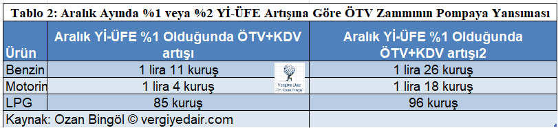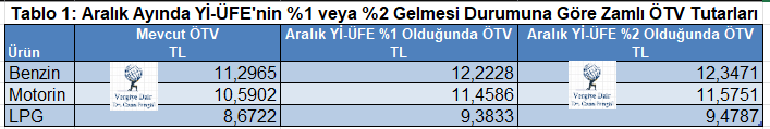 Yukarıdaki tablodan görüleceği üzere; Aralık 2024 dönemi aylık Yİ-ÜFE oranı %1 bile gelse bir litre benzin için pompaya yansıyacak ÖTV+KDV zammı 1 lira 11 kuruş olacaktır.