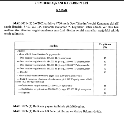 Türkiye son dönemde yüksek enflasyon yaşamaktadır. Yaşanan bu enflasyona ve enflasyonun da üzerinde artan otomobil fiyatlarına rağmen ÖTV matrah dilimleri en son 24 Kasım 2022 tarihli Resmi Gazetede yayımlanan 6417 sayılı Cumhurbaşkanı Kararı ile güncellenmiştir.