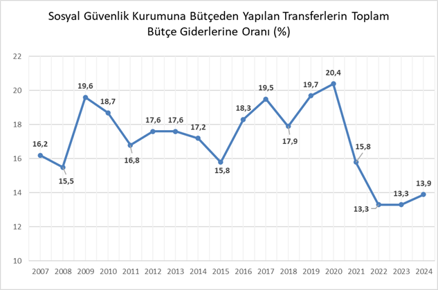 Aşağıdaki grafikte, 2007 yılından 2024 yılı sonuna kadarki dönemde, SGK’ya bütçeden yapılan transferlerin toplam bütçe içindeki payı yer almaktadır. Verilere göre, EYT düzenlemesinin de yapıldığı son üç yılda bütçeden SGK’ya yapılan transferler 18 yıllık dönem içinde en düşük seviyeleri temsil etmektedir.