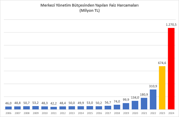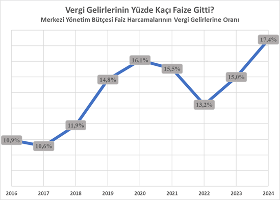 2016 yılında, ödediğimiz her 100 lira verginin 10 lira 90 kuruşu faize giderken 2024 yılında ödediğimiz her 100 lira verginin 17 lira 40 kuruşu faize gitmiştir.