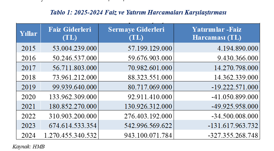 Son yıllık verilere baktığımızda, Merkezi Yönetim Bütçesinden yapılan yatırım harcamaları faiz harcamalarının üzerinde ikin 2024 yılına geldiğimizde 1 trilyon 270 milyar liralık faiz harcamasına karşılık 943 milyar liralık yatırım yapılmıştır. Faiz harcaması toplam yatırım harcamalarının 327 milyar lira üzerinde gerçekleşmiştir.